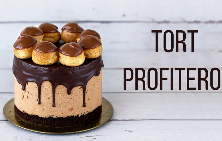 Tort profiterol cu ciocolata si choux umplute cu crema de vanilie. Un deliciu!